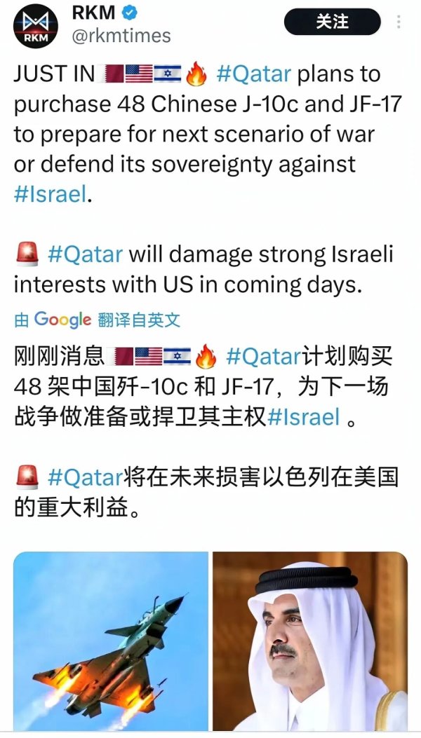 外媒9月11日报道说为了保卫自己的主权,可能订购48架歼-10CE和枭龙FJ-17红领金服,这个可能性有多大呢? 卡塔尔媒体报道截图 以色列公然违反国际法,轰炸....